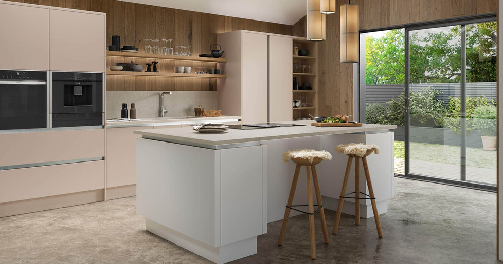 A slab door with even softer matte / low sheen finish, tactile to the touch; luxurious feel but practical.
